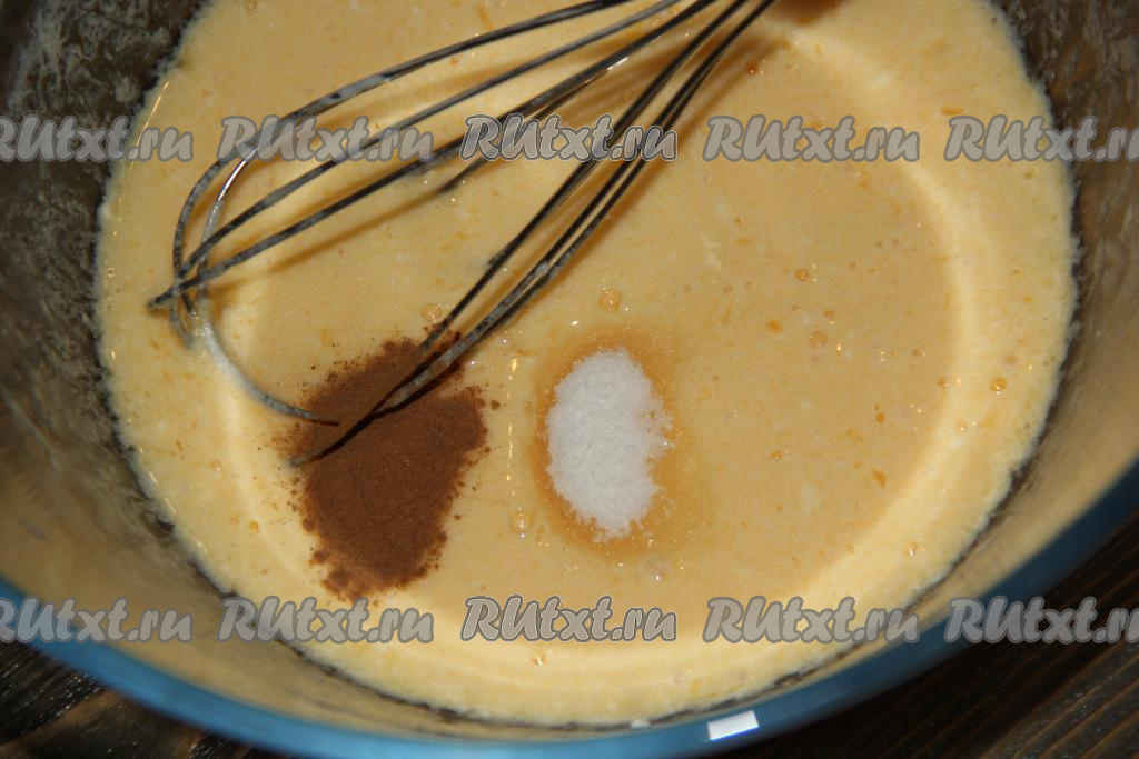Затем к яичной массе влить молоко, добавить ванильный сахар и половину чайной ложки корицы, перемешать венчиком.