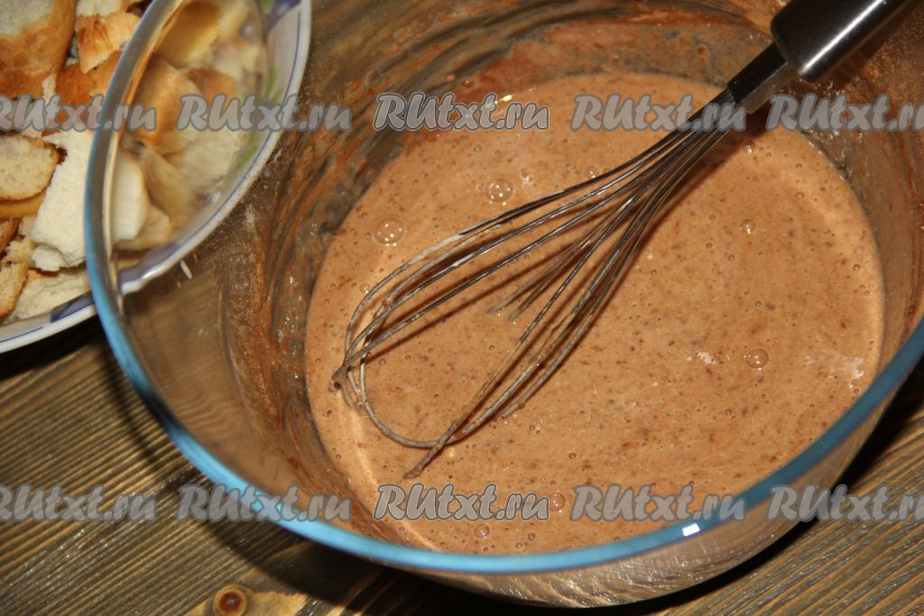 Добавить к кусочкам белого хлеба яично-молочную заливку и перемешать тщательно лопаткой. Все кусочки должны искупаться в заливке. Оставить хлеб на минут 10.