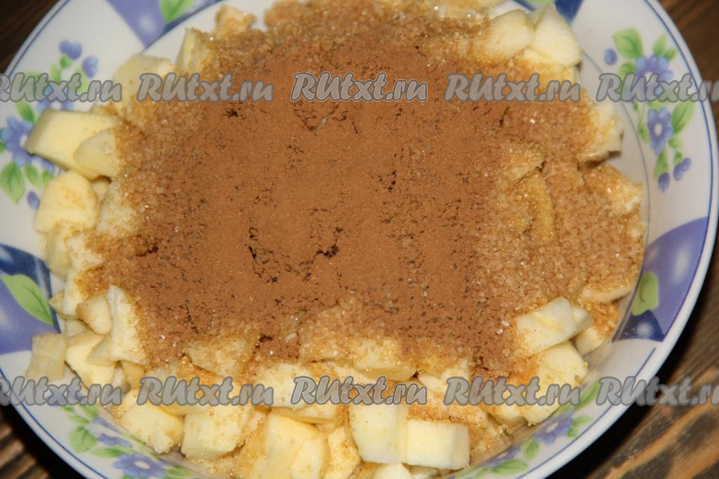 Всыпать к яблокам сахар (я использовала тростниковый сахар) и половину чайной ложки корицы.