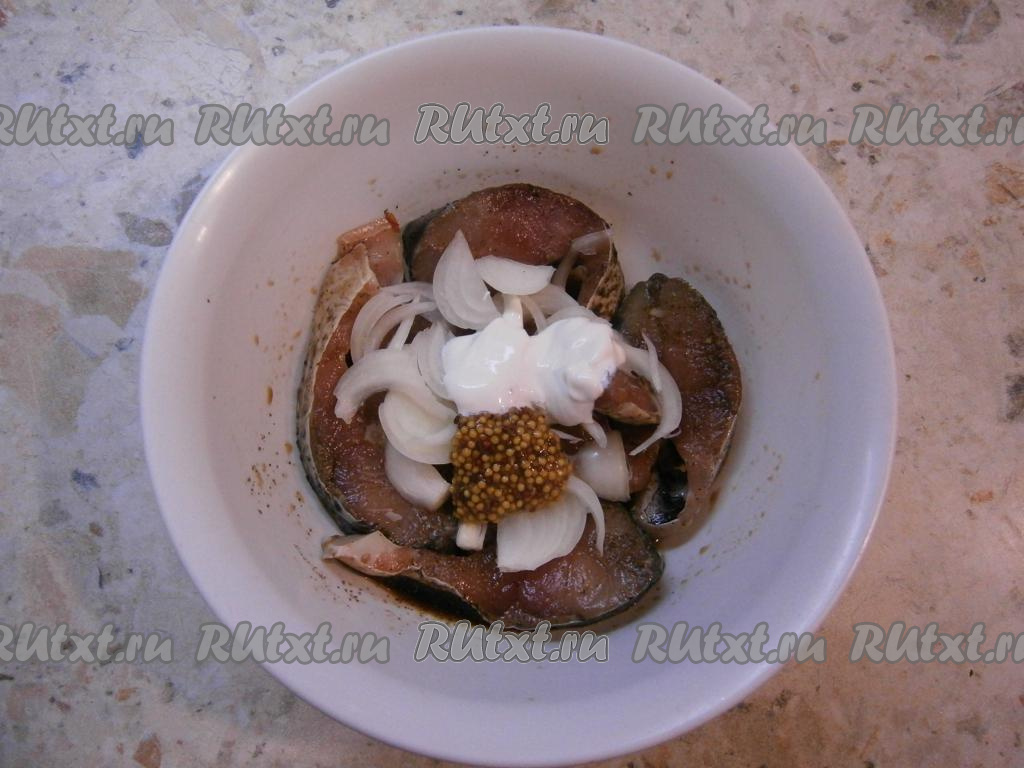 Влить соевый соус, если у вас нет соевого соуса, можете посолить рыбку по вкусу. Добавить очищенный и нарезанный перьями или полукольцами репчатый лук, сметану и французскую горчицу.