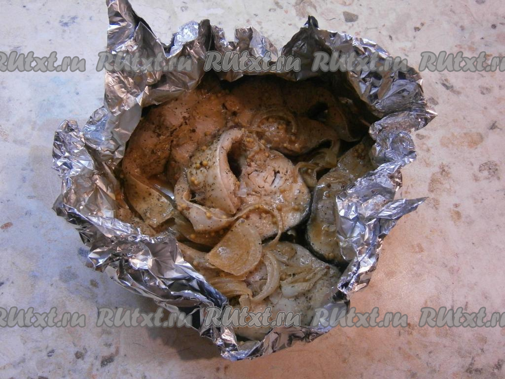 Рыбу перемешать и оставить на 15 минут, после чего переложить ее вместе с луком и соусом в фольгу, сложенную вдвое, формируя формочку. Старайтесь, чтобы фольга была в виде формы с достаточно высокими бортиками, так мы оставим чашу мультиварки чистой.