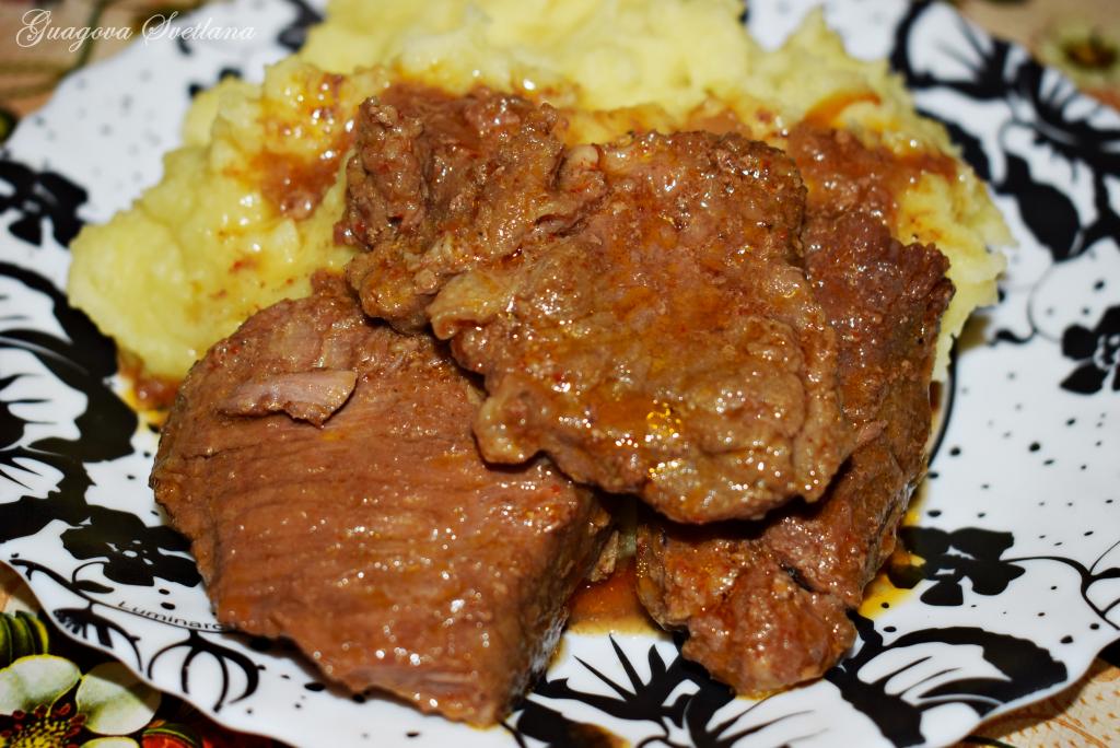 Когда лук станет прозрачным, добавляем воду к мясу, подсаливаем по вкусу. Ставим мультиварку на режим "Тушение", закрываем крышку и тушим говядину 1,5 часа. К готовому мясу добавляем чеснок, пропущенный через пресс, перемешиваем.