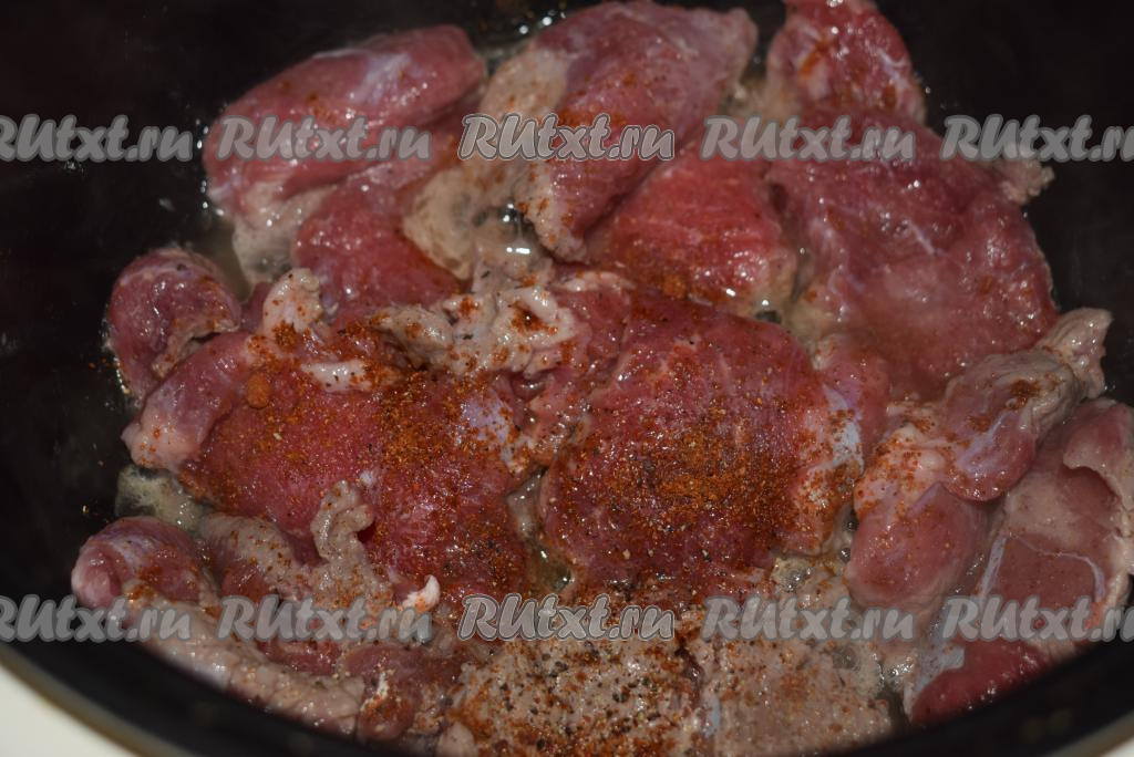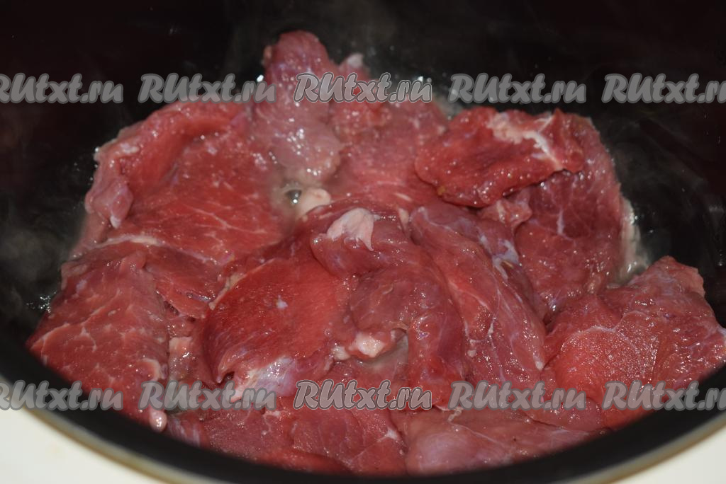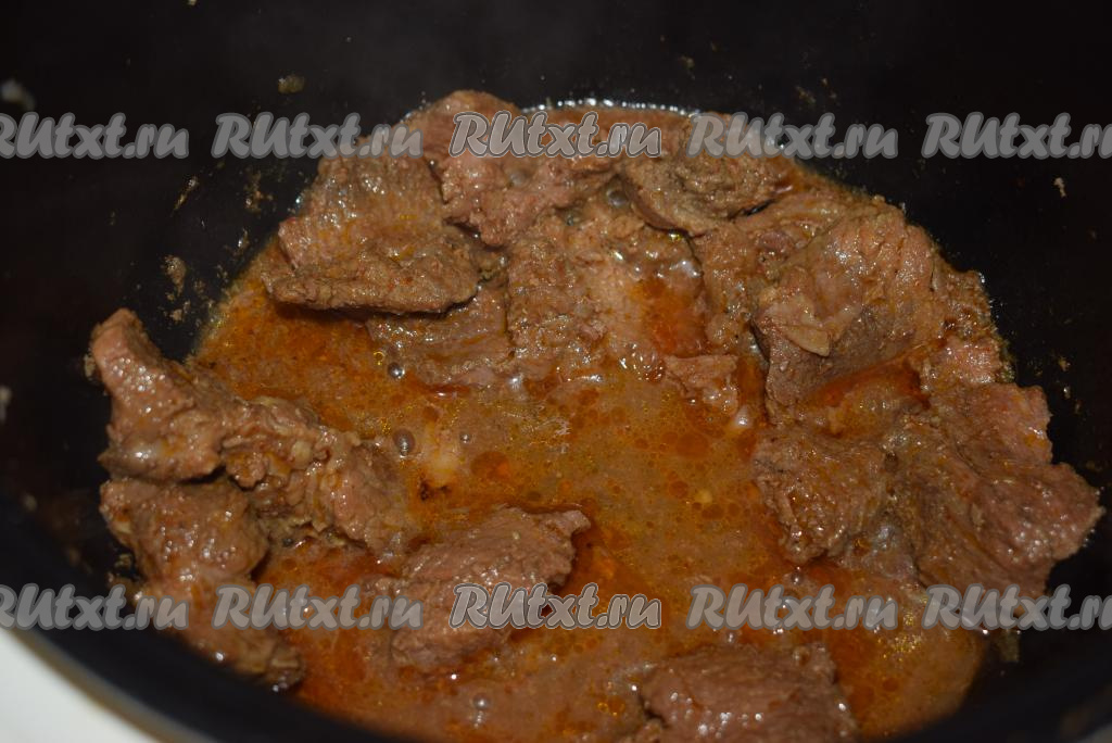 Закрываем крышку мультиварки и жарим мясо, периодически помешивая, до полного выпаривания жидкости (примерно, 25 минут).