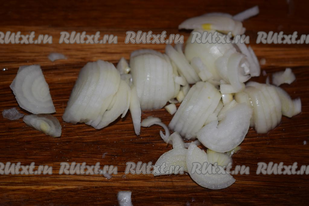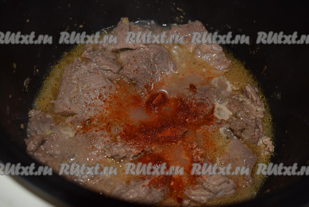 К обжаренному мясу добавляем паприку и лук, обжариваем, иногда помешивая, примерно, 10 минут (до прозрачности лука) под закрытой крышкой.