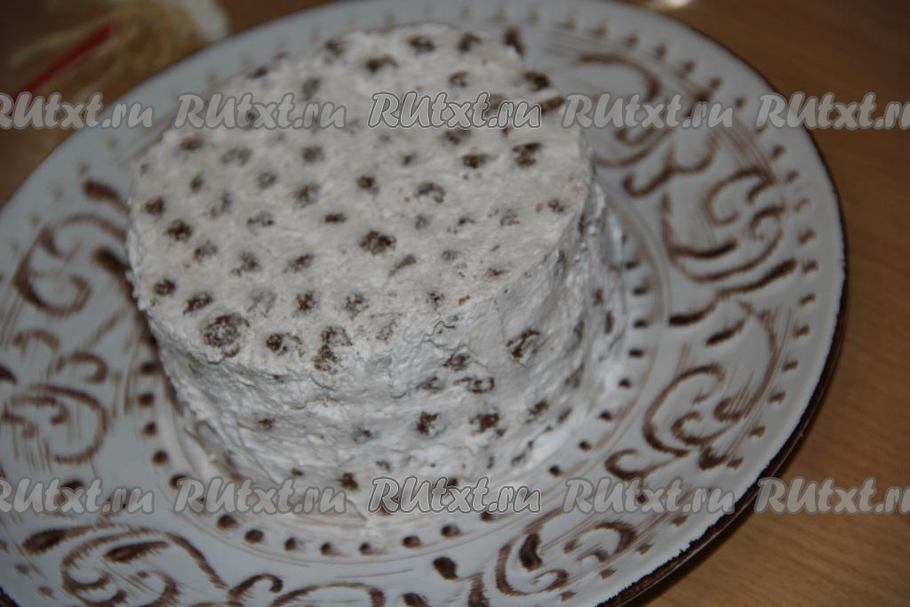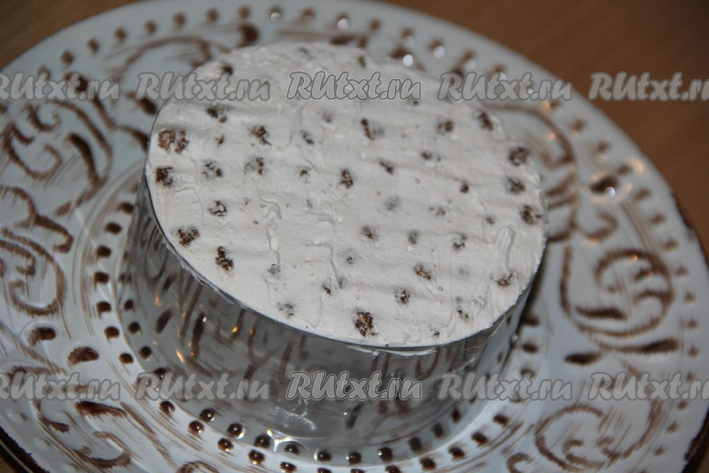 Накрыть торт пищевой плёнкой и отправить пропитаться в холодильник на 2-4 часа. По прошествии времени достать торт, убрать бортик (бортик снимается очень легко).