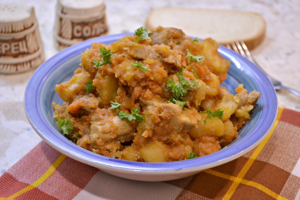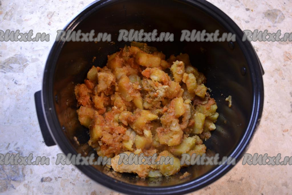 Выставить программу "Томление" на 1,5 часа, крышку мультиварки закрыть. Через 1 час загляните в мультиварку, добавьте томатную пасту, аккуратно все перемешайте и, если недостаточно будет жидкости, влейте немного воды (или бульона). Готовое жаркое перемешать.