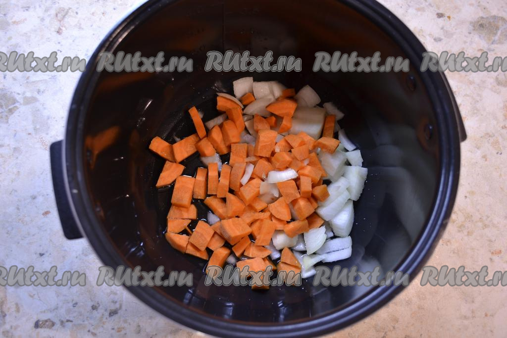 Морковь, картошку и лук очистить. Лук и морковь нарезать средними кубиками (или кусочками), выложить в чашу мультиварки, добавить растительное масло.