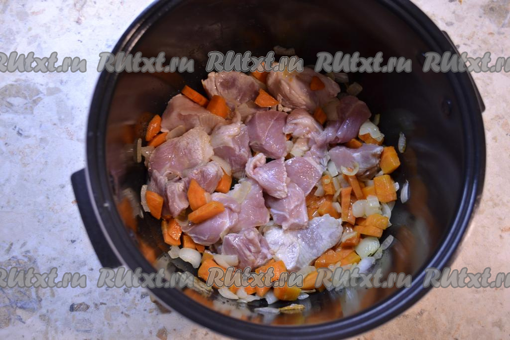 Выставить программу "Жарка" на 18 минут. Обжаривать овощи, помешивая, минут 7, после чего добавить мясо, нарезанное средними кусочками. Обжаривать далее, иногда перемешивая, до окончания программы.