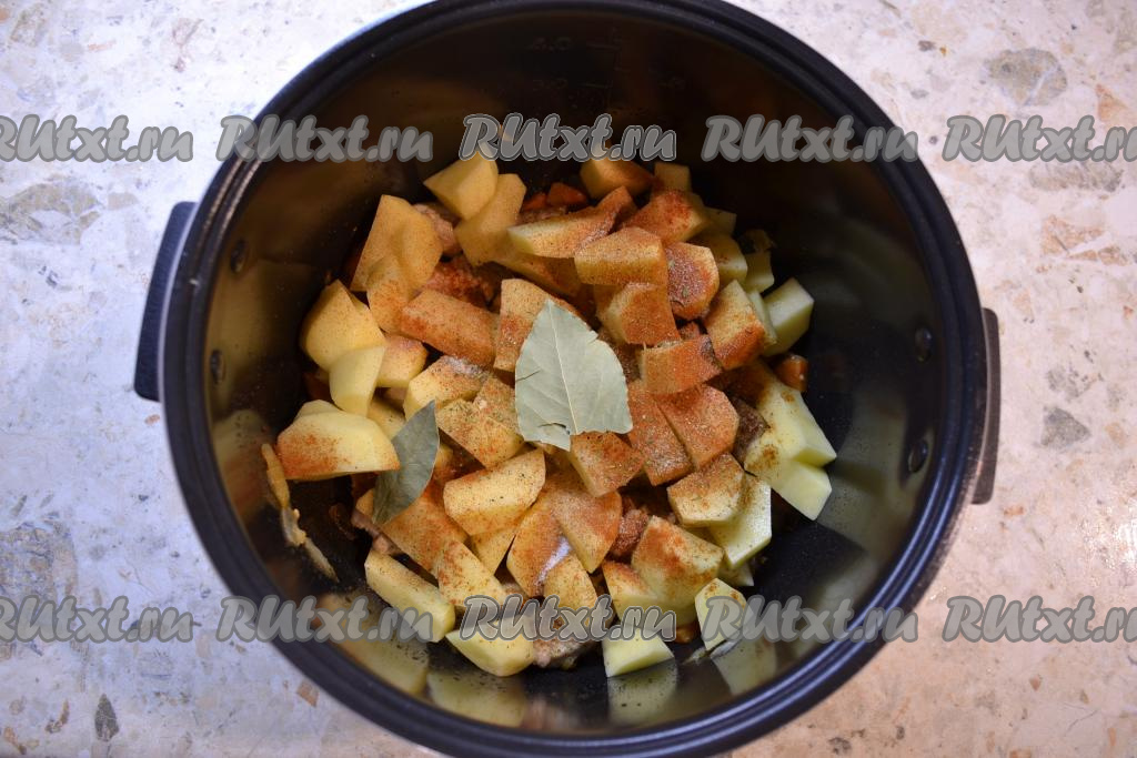 Затем добавить в чашу нарезанный довольно крупными кубиками (или кусочками) картофель, всыпать соль, специи, чесночный перец и паприку, добавить лавровый лист, перемешать.
