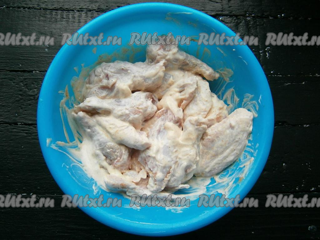 В сметану выложить крылья, хорошо перемешать, чтобы все кусочки крылышек были покрыты сметаной, и оставить на 20 минут.