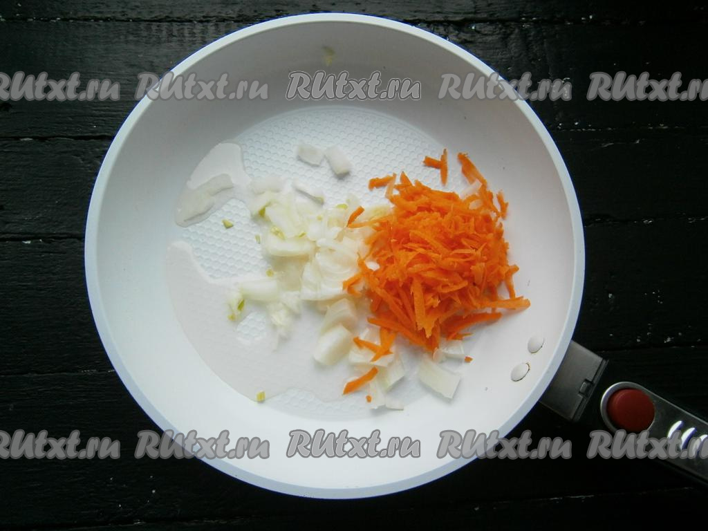 В сковороде разогреть растительное масло, добавить нарезанный произвольно репчатый лук и натертую на крупной терке морковь.