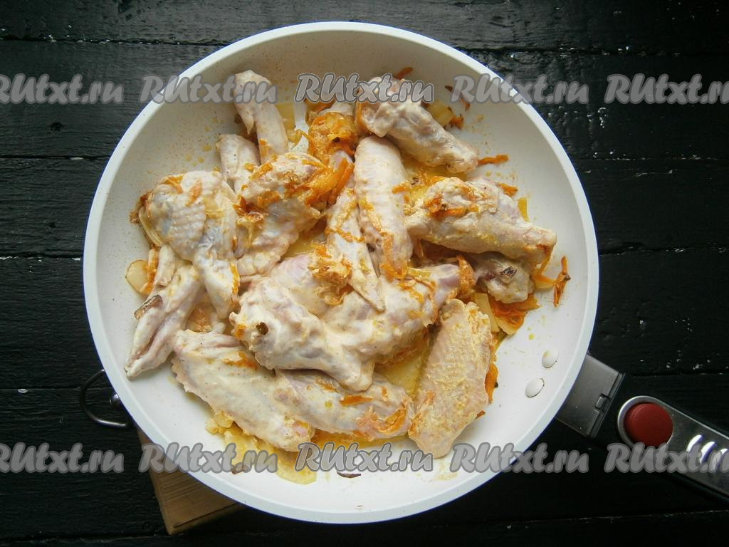 Овощи обжарить на среднем огне в течение 3-4 минут, помешивая, после чего добавить крылья вместе со сметаной, перемешать и обжарить 4-5 минут.