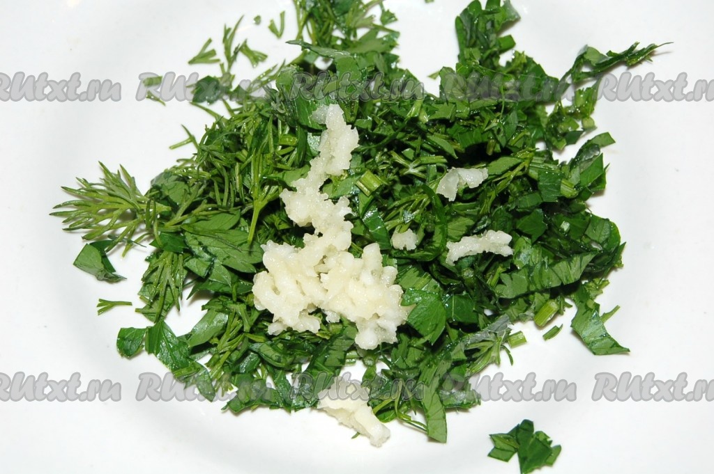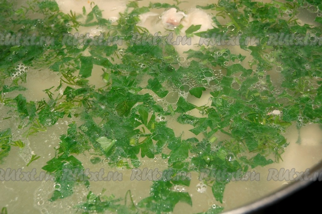 Нарезать мелко любую зелень, чеснок и положить в готовый бульон из курицы.