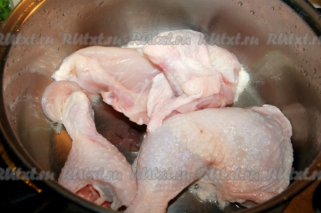 Залить курицу холодной водой и поставить вариться. После закипания воды снять пену, уменьшить огонек, посолить, поперчить и варить 1 час до полной готовности мяса. Затем курицу вытащить из бульона, разрезать на порционные кусочки и положить обратно в бульон.