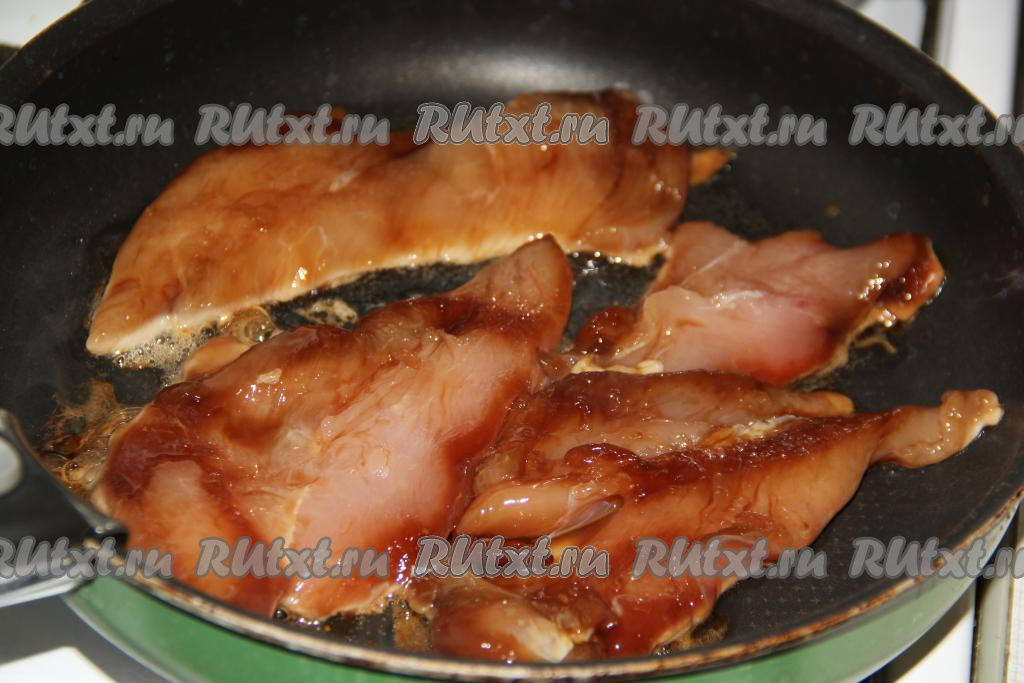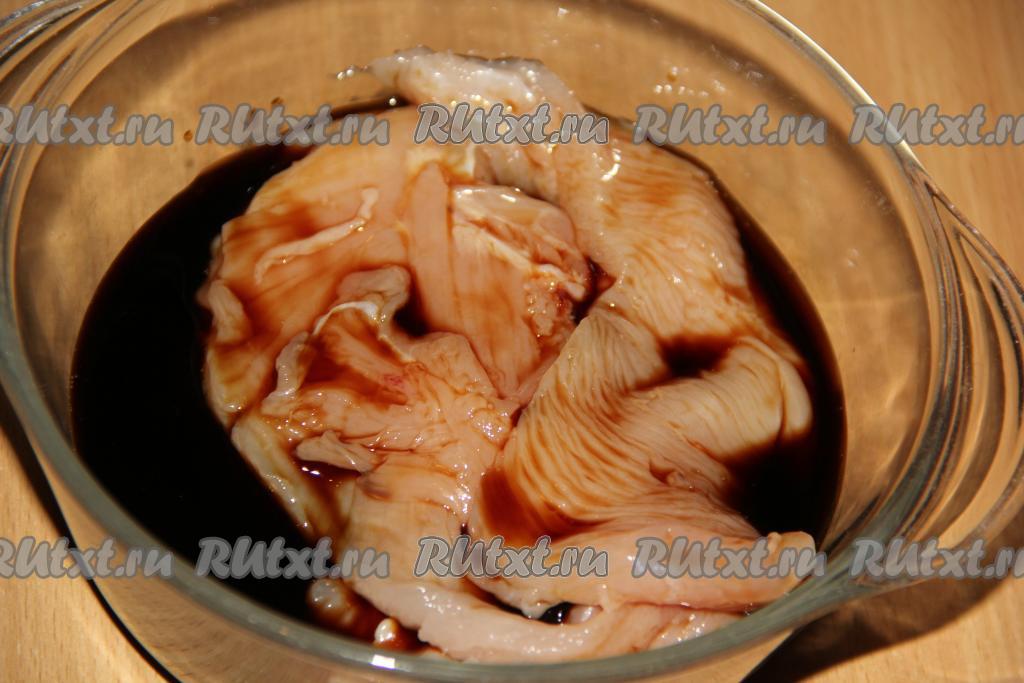 Куриное филе нарезать на кусочки среднего размера, влить к мясу 50 мл соевого соуса и оставить промариноваться на 30-45 минут.