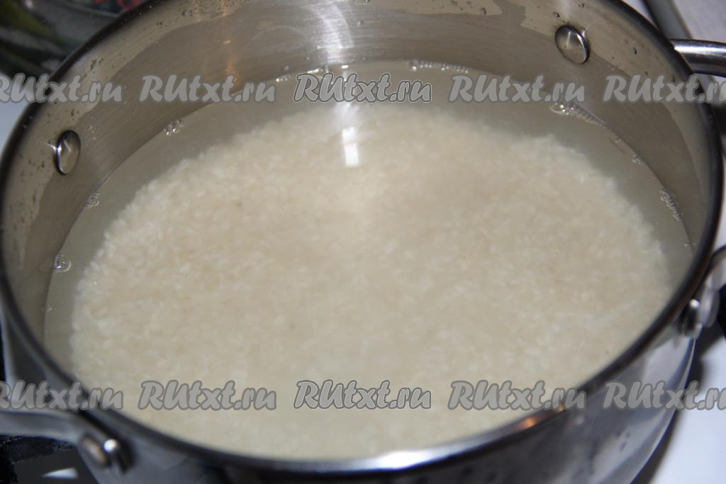 Для начала приготовить рис. Рис для суши хорошо промыть, переложить в кастрюлю и залить холодной водой в соотношении 1:2 (1 часть риса и 2 части воды), поставить на огонь, после закипания, уменьшив огонь до минимума, варить до полного испарения жидкости (обычно жидкость полностью испаряется, а рис становится готовым через 15-20 минут). Когда вода испарится, снять кастрюлю с огня, влить в рис 1-2 столовые ложки рисового уксуса, перемешать (уксус можно и не добавлять, но с ним рис становится блестящим, с приятным вкусом). Готовый рис остудить, накрыв кастрюлю полотенцем.