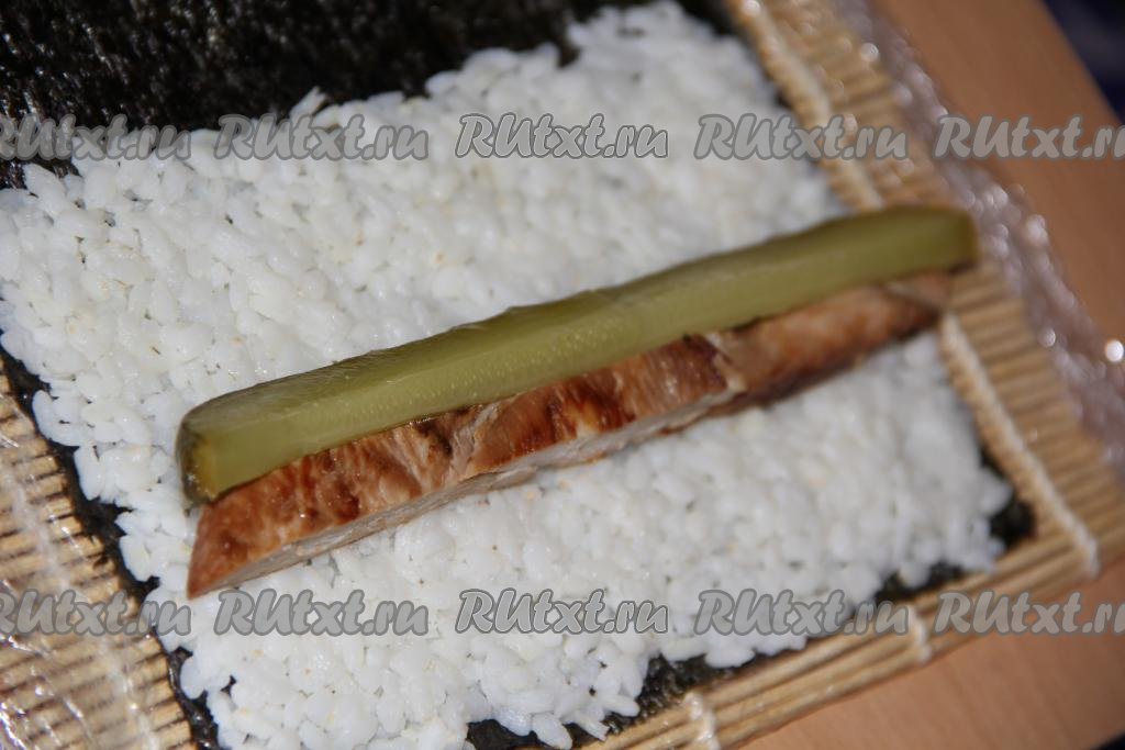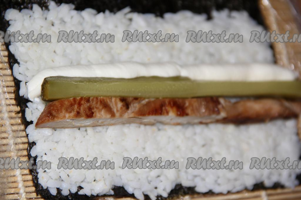 Я листы нори не разрезала, готовила роллы на целом листе. Лист нори блестящей стороной вниз выложить на циновку. Небольшое количество риса равномерно распределить по 2/3 поверхности листа, а, примерно, 1/3 листа оставить чистой. Выложить на рис брусок куриного филе и брусочек огурца (как на фото).