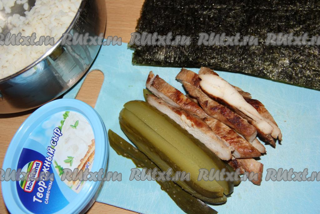 Кусочки жареного куриного мяса остудить. Нарезать на длинные брусочки филе и огурцы (я готовила роллы с маринованным огурцом, можно готовить и со свежим огурчиком). Творожный сыр выложить в кондитерский мешок.