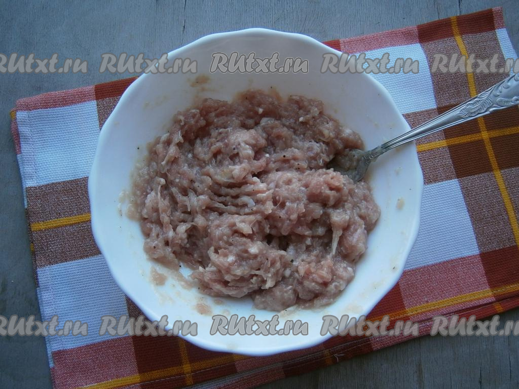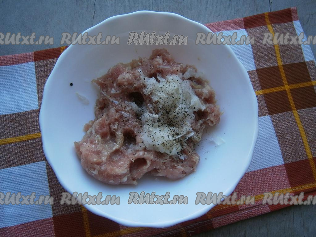 Для приготовления фарша мякоть свинины перекрутить на мясорубке (или измельчить в блендере), добавить очищенный и натертый на мелкой терке репчатый лук, соль и черный молотый перец.