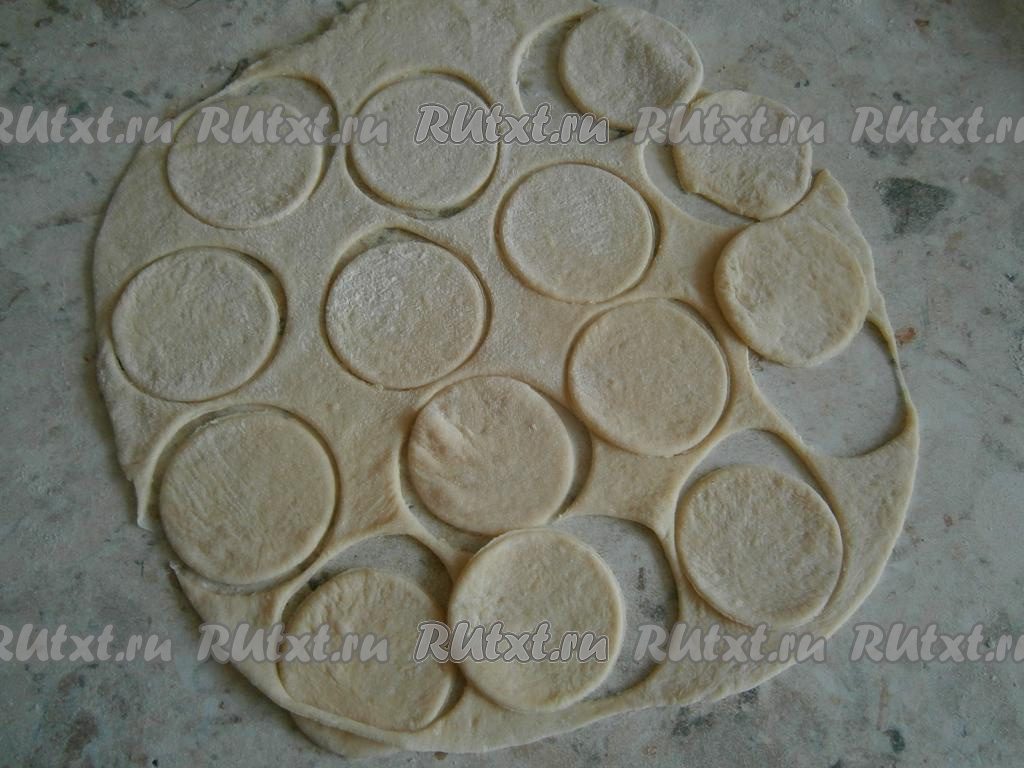 Тесто обмять, разделить его на 2 части. На присыпанном мукой столе раскатать каждую часть теста в тонкую лепешку. Рюмкой вырезать кружочки.