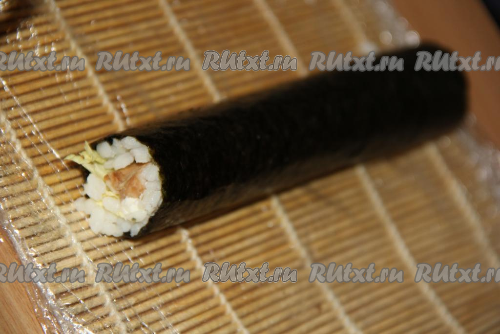 Аккуратно свернуть лист нори с начинкой в плотный рулет, начиная сворачивать с того края, на котором выложен рис. Чистый край листа нори я смазала водичкой (благодаря смазыванию листа нори водой, ролл с курицей хорошо скрепится и получится более красивым и ровным).