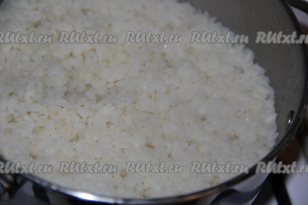 Для того чтобы роллы получились вкусными, немаловажно правильно приготовить рис. Рис хорошо промыть в проточной воде, затем выложить в кастрюлю и залить водой комнатной температуры в соотношении 1:2 (то есть должна быть 1 часть риса и 2 части воды), поставить на огонь. После того как вода закипит, убавить огонь до минимума и, накрыв кастрюлю крышкой, варить рис до полного испарения жидкости (у меня на варку риса уходит, примерно, 20 минут с момента закипания). Как только вся вода испарится, снять кастрюлю с огня и добавить, по желанию, рисовый уксус, перемешать рис и, накрыв кастрюлю хлопчатобумажным полотенцем, оставить остывать.