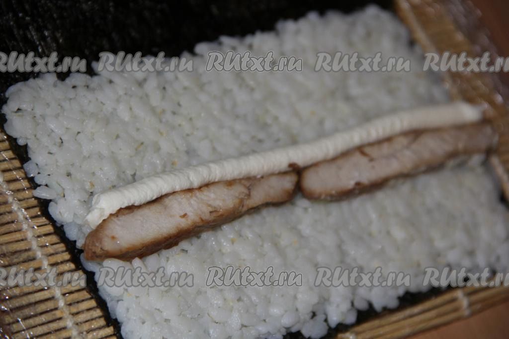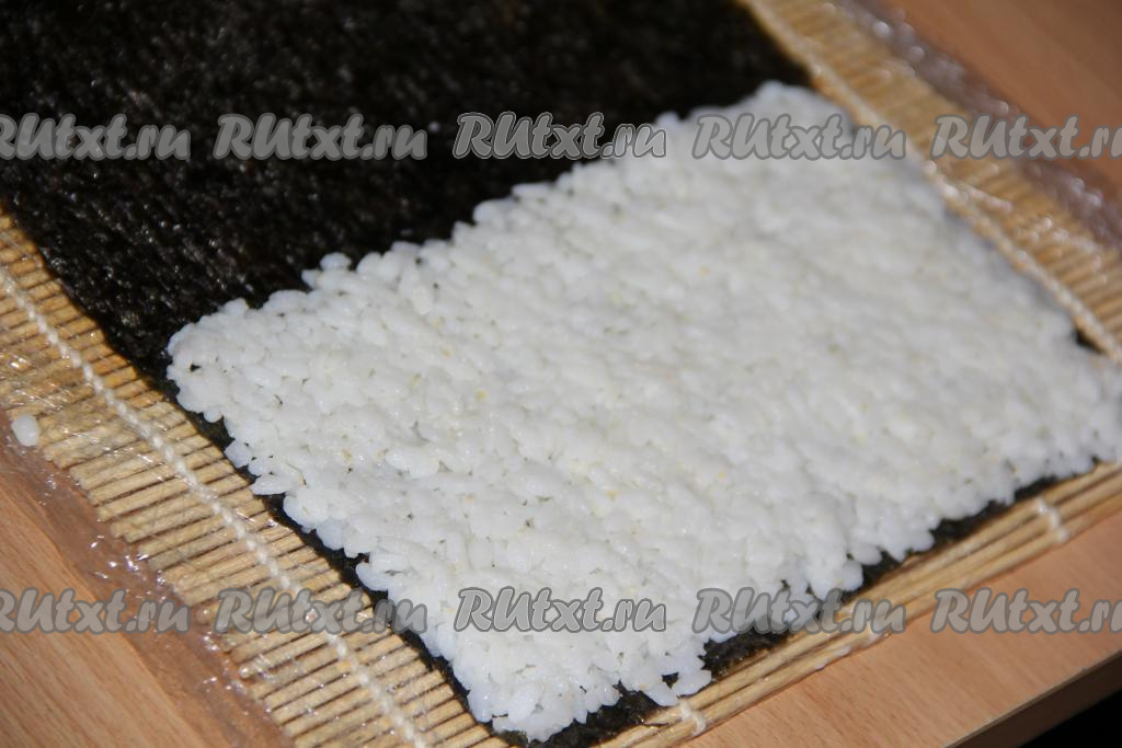 Приступаем непосредственно к приготовлению роллов в домашних условиях. Я использовала целый лист нори, роллы получились не маленькими, но очень ровными и красивыми. Лист нори блестящей стороной вниз выложить на циновку. На 2/3 листа нори выложить небольшое количество риса и равномерно его распределить. Оставить чистой, примерно, 1/3 листа.
