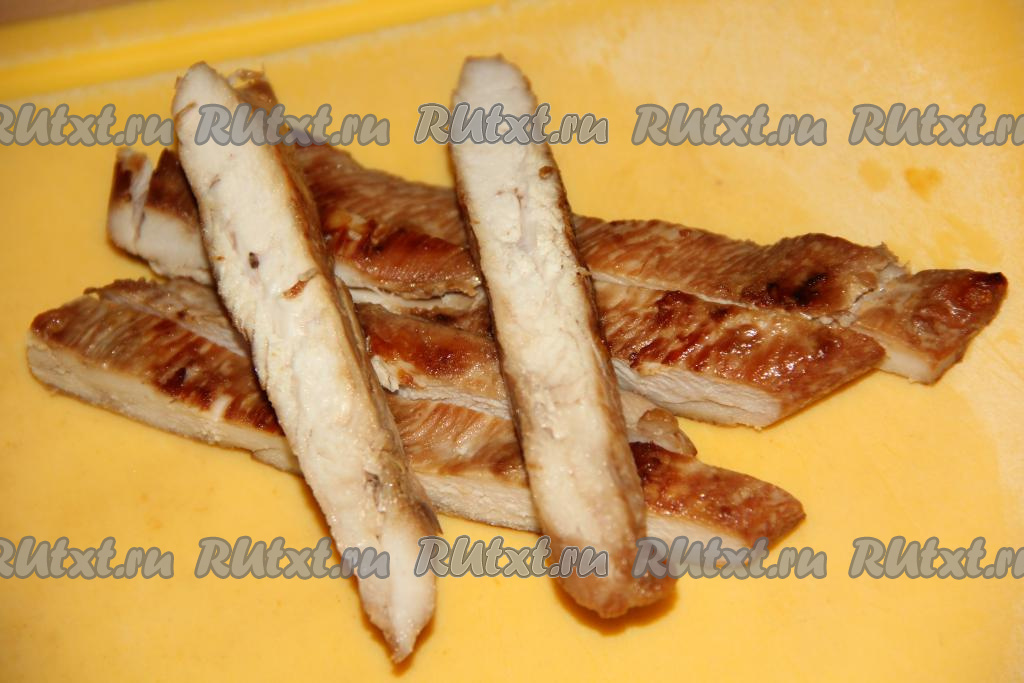 Остывшее жареное куриное филе нарезать на длинные брусочки.