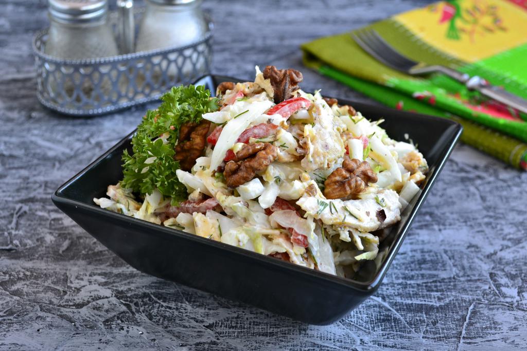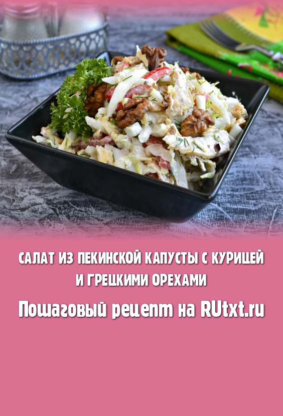 Салат, приготовленный из пекинской капусты с курицей и грецкими орехами, - простое, нежное, очень вкусное блюдо. Салатик можно подать к обеду или ужину в самостоятельном виде или в качестве дополнения к основным блюдам. Вместо майонеза можете использовать сметану или домашний йогурт. Приготовьте салат по этому рецепту и вы точно останетесь довольны его приятным вкусом!