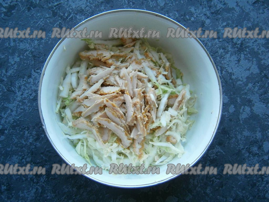 Болгарский перец освободить от семенной коробки, чеснок очистить. Куриное филе (у меня запеченное филе, но можно взять и отварное) нарезать соломкой или брусочками. Нашинковать пекинскую капусту, немного посолить, чуть примять руками. Соединить в миске нашинкованную пекинскую капусту и нарезанное куриное мясо.