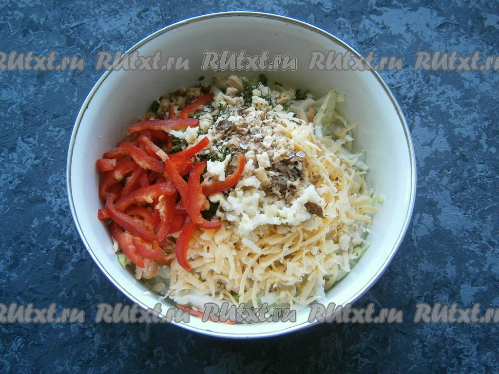 Сюда же добавить нарезанный соломкой болгарский перец, пропущенный через пресс чеснок и рубленные грецкие орехи.