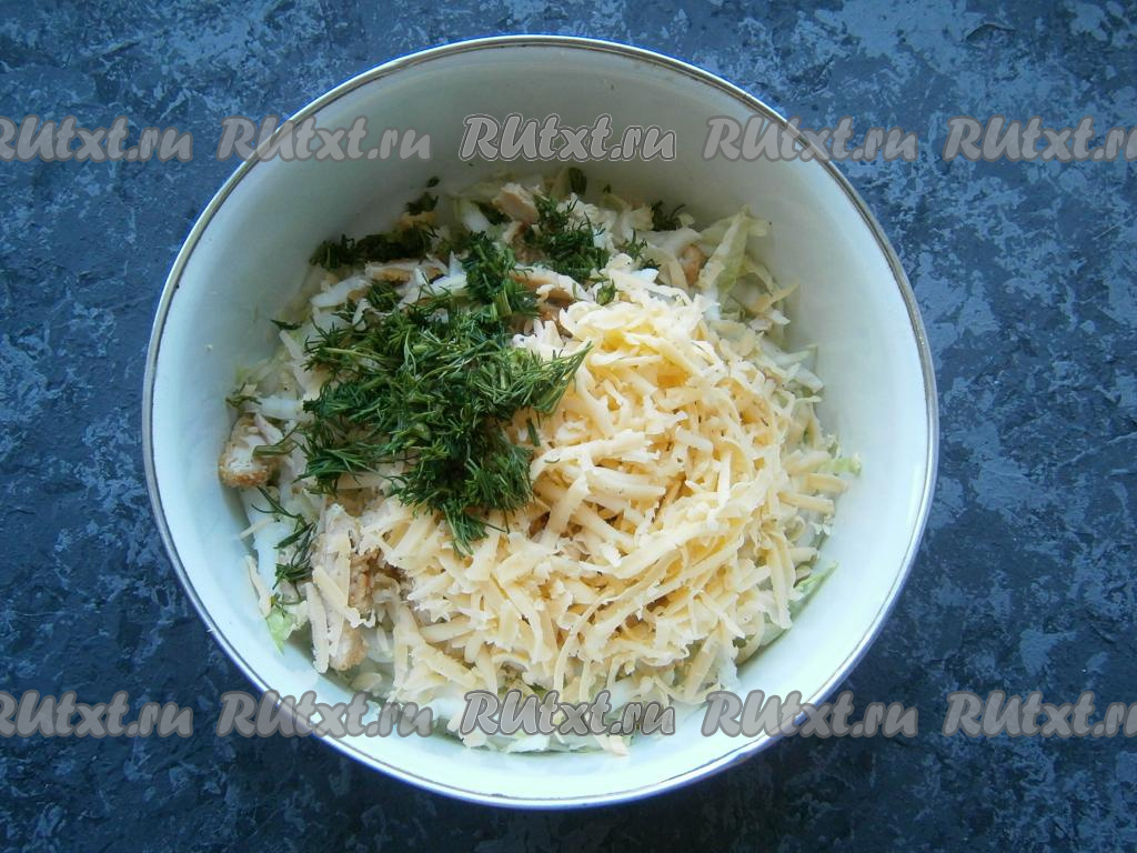 Мелко нарезанный укроп и натертый на крупной терке сыр выложить в салат из капусты и куриного мяса.