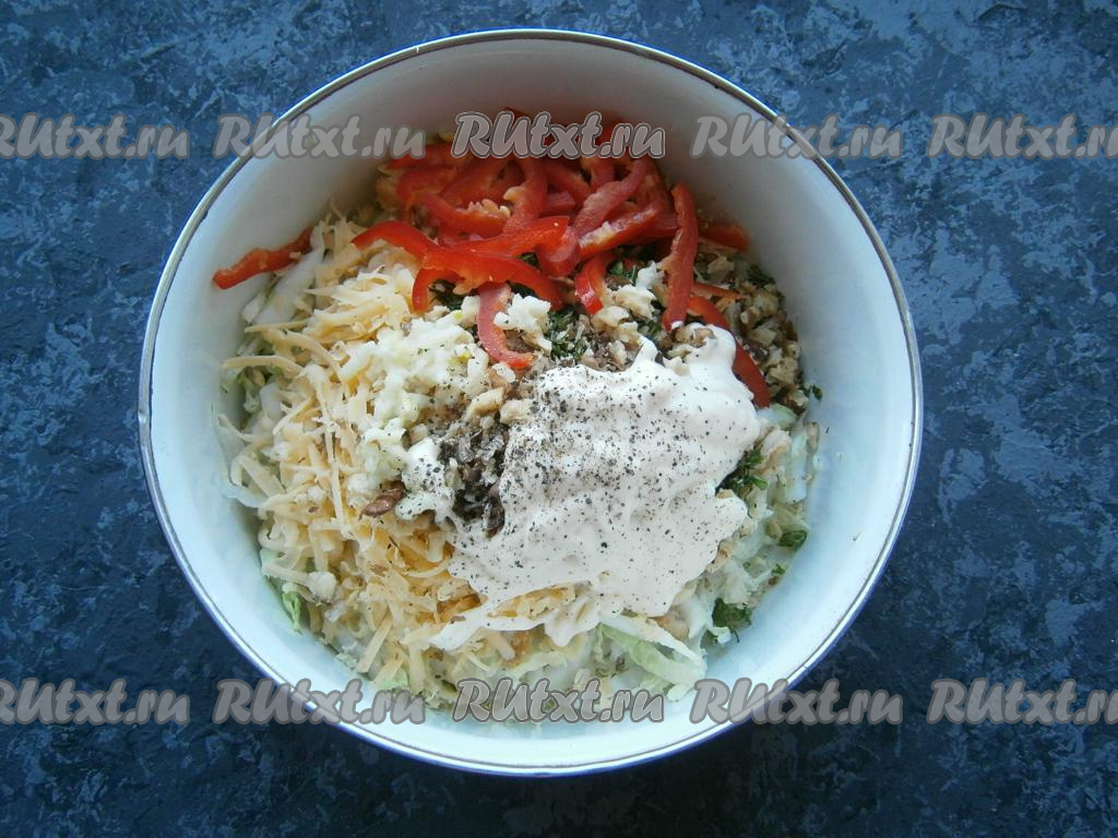 Также добавить майонез, соль и молотый черный перец по вкусу.