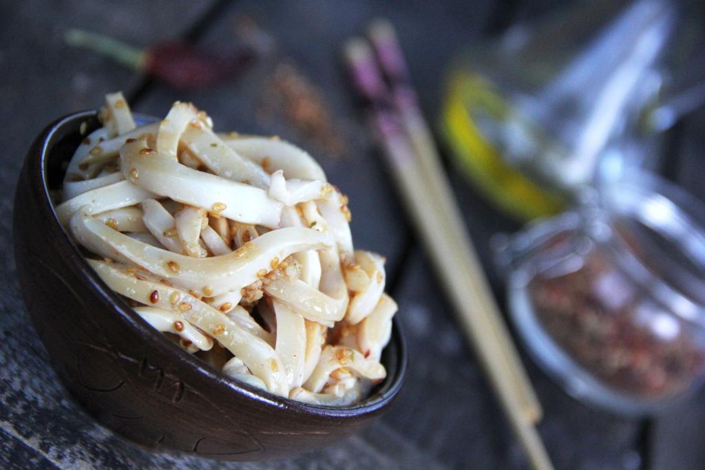 Добавить горячий маринад к кальмарам и перемешать. Поставить хе в холодильник на 10 часов.
