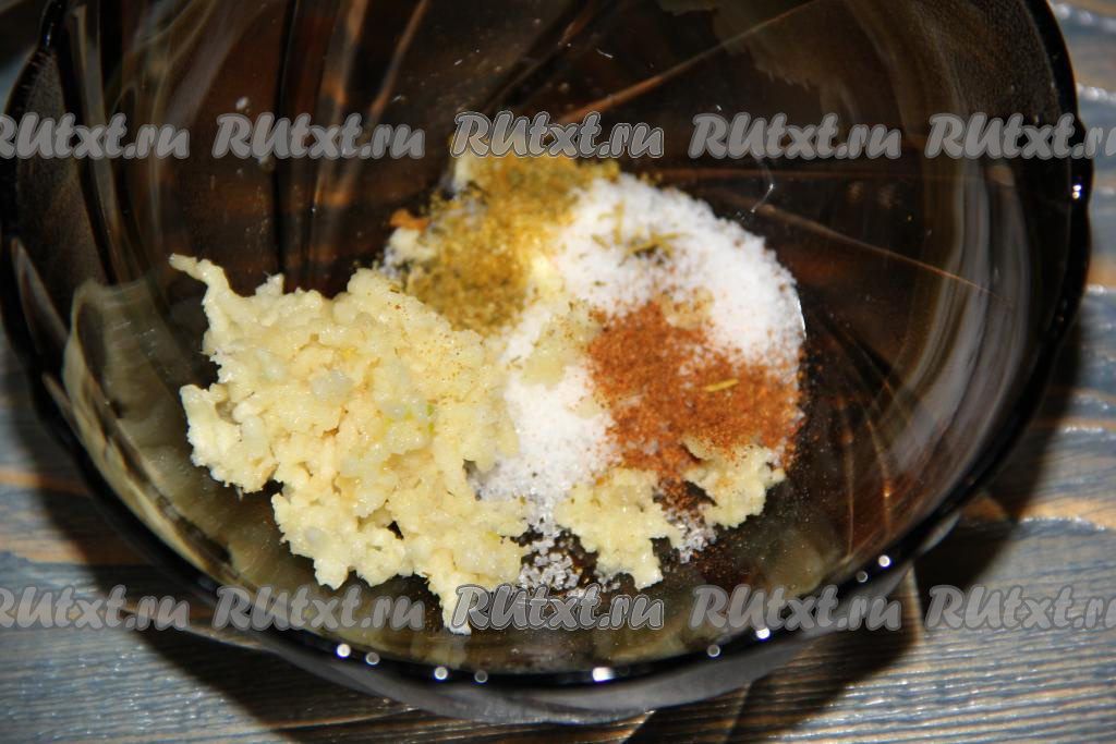 Для приготовления маринада для хе в миску всыпать соль, приправу для моркови по-корейски, смесь перцев, добавить чеснок, пропущенный через пресс.