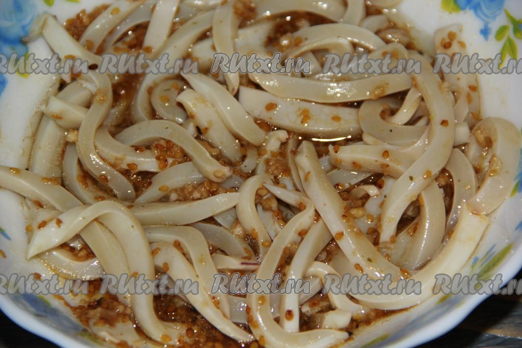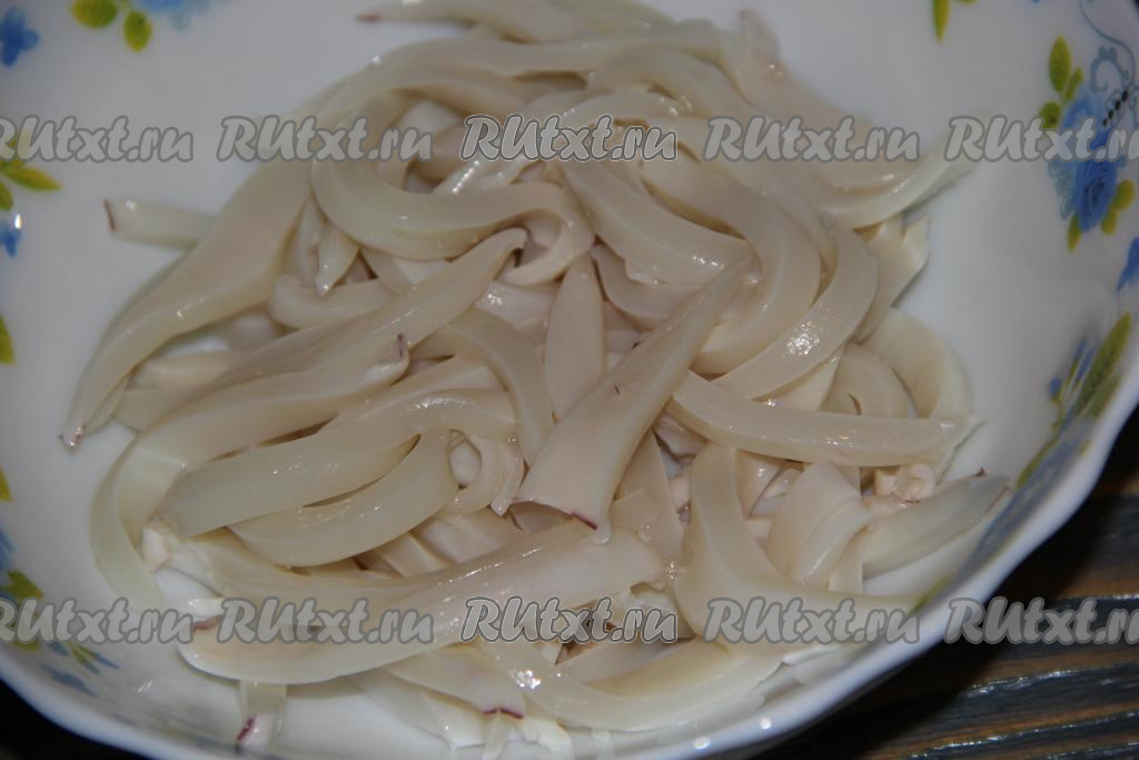 Кальмары очистить от плёночки.