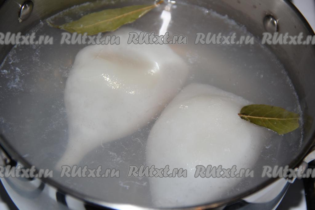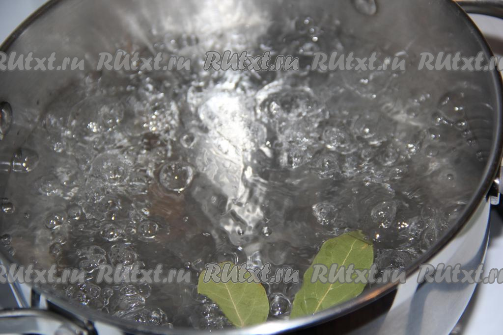 Воду для варки кальмаров довести до кипения, добавить пару лавровых листов.