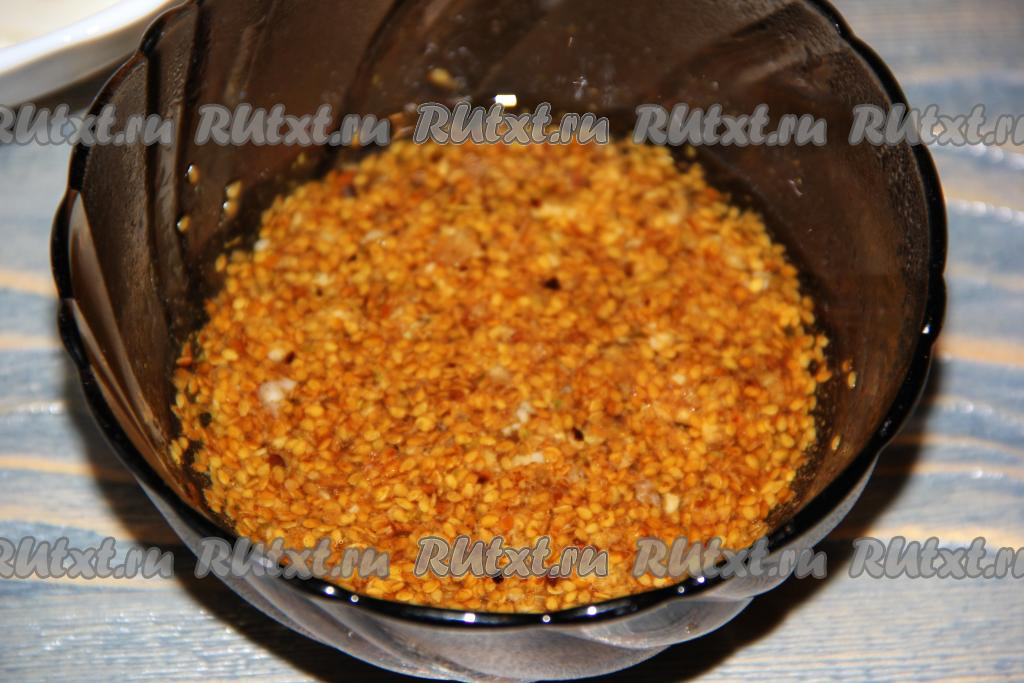 Затем в маринад влить уксус, растительное масло и добавить кунжут. У меня покупной обжаренный кунжут. Для хе можно взять белый кунжут и обжарить его, помешивая, на сухой сковороде до золотистого цвета. Перемешать маринад, поставить его на 1 минуту в микроволновку и прогреть до горячего состояния.