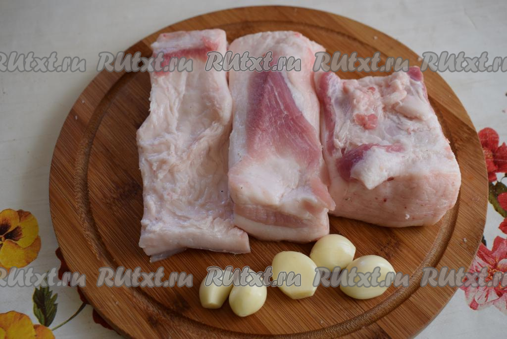 Сало промыть и обсушить бумажными полотенцами, чеснок очистить. Я разрезала сало на 3 кусочка.