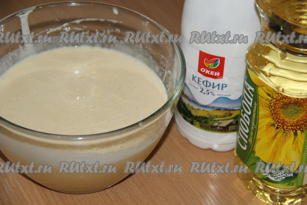 Затем в яично-сахарную смесь влить кефир и масло, перемешать жидкую смесь на низкой скорости миксера до однородности.