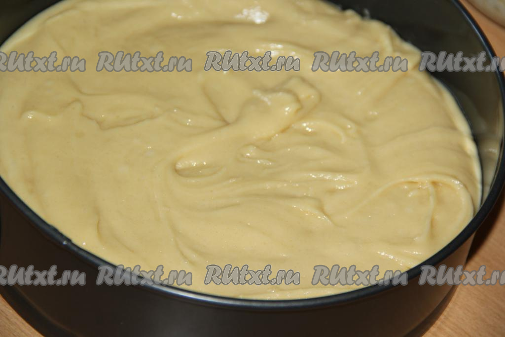Жидкую смесь влить в мучную массу и перемешать тесто лопаткой. Тесто получится гладким и однородным, в меру густым. Форму для выпечки лучше взять разъёмную (у меня форма диаметром 26 см). Выложить тесто в форму и разровнять.
