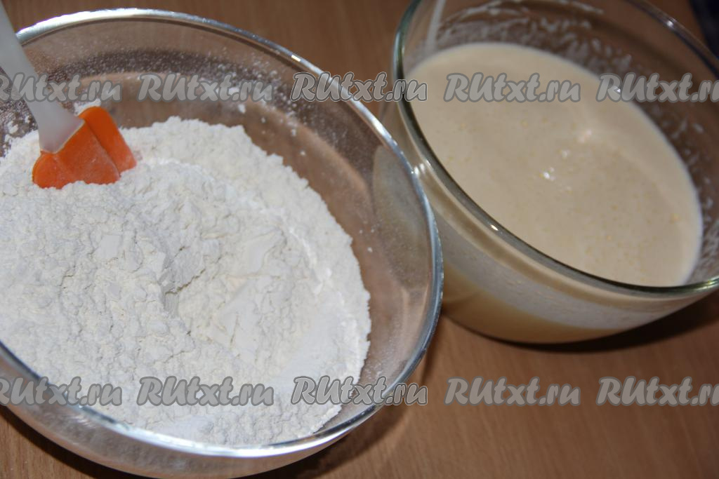 Просеять муку. В муку всыпать разрыхлитель, перемешать мучную массу.