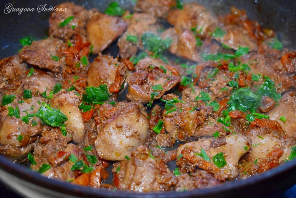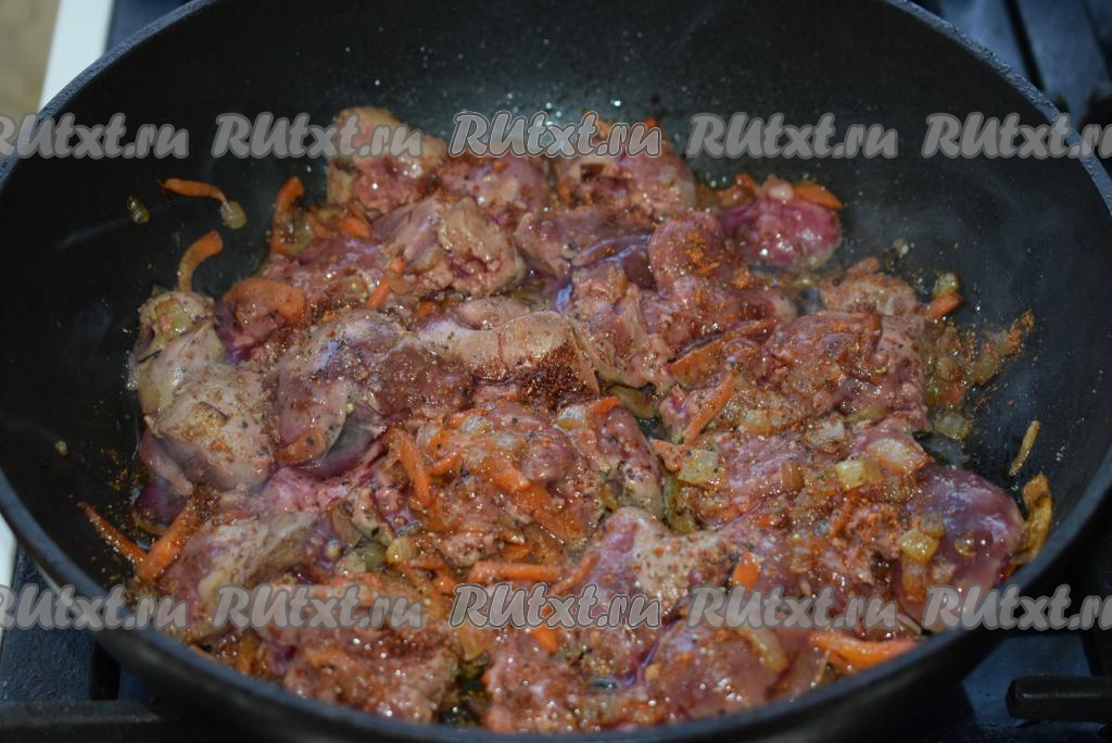 К овощам, обжаренным до полуготовности, добавим куриную печень и перемешаем. Делаем огонь слабым и обжариваем печень с овощами, примерно, 10-12 минут, периодически помешивая.
