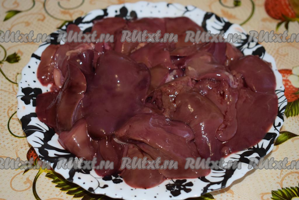 Куриную печень промоем под холодной водой, удалим пленочки и нарежем на одинаковые кусочки (мелко резать не нужно).
