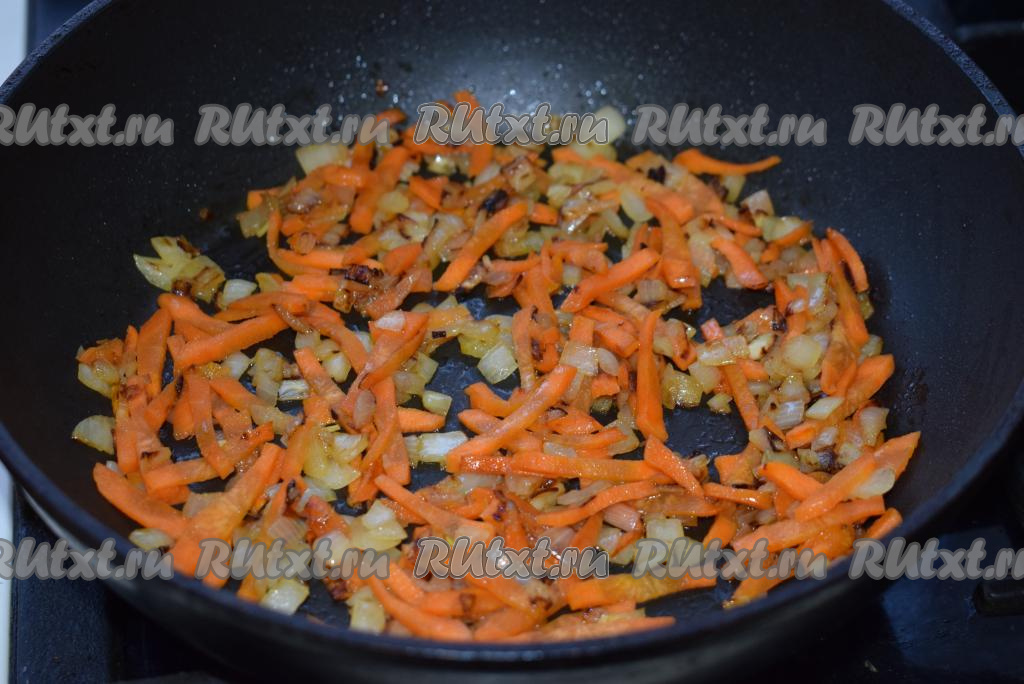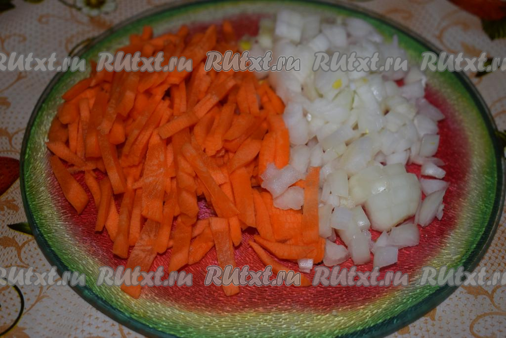 Нарежем лук на мелкие кубики, а морковь - тоненькой соломкой.