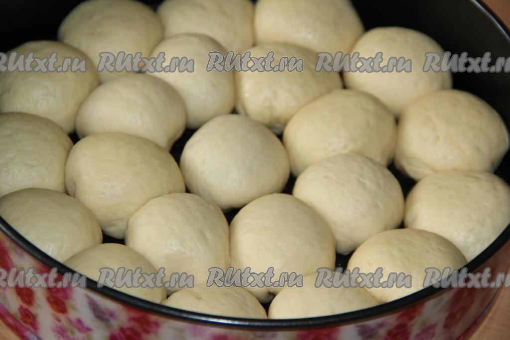 Форму для выпечки (лучше разъёмную) смазать растительным маслом. У меня форма диаметром 28 см. Выложить булочки (у меня получилось 22 булочки с джемом) в форму и оставить для расстойки на 1 час.