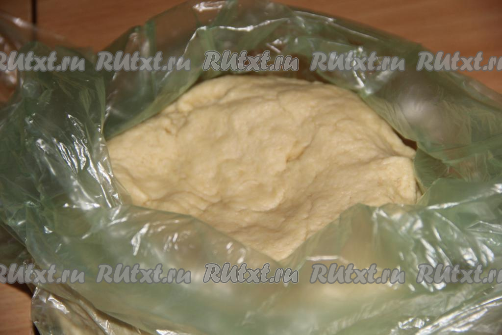 Сначала перемешать тесто ложкой, оно получится липким, а затем, подсыпая постепенно оставшуюся муку, замесить нежное и пластичное тесто. Убрать тесто в пакет и положить в холодильник на 2-4 часа (можно и на более длительное время).