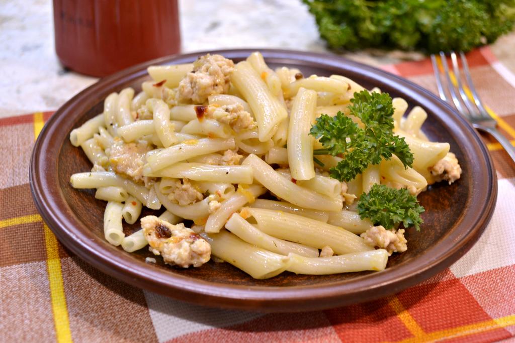 Подать вкуснейшие макароны по-флотски, приготовленные с фаршем в мультиварке, горячими с соленьями или овощным салатом.