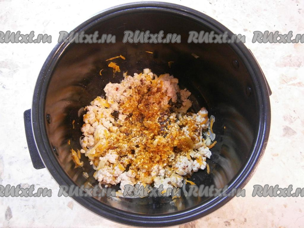 Выставить программу "Жарка" на 10 минут и обжаривать овощи, помешивая, до сигнала. Затем в чашу мультиварки к обжаренным овощам добавить фарш, соль, специи, приправу и чёрный молотый перец, перемешать и выставить программу "Жарка" на 15 минут. Обжаривать фарш, периодически перемешивая, до сигнала.