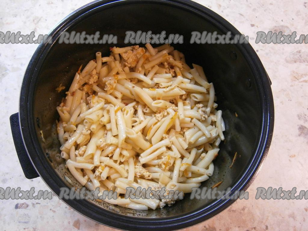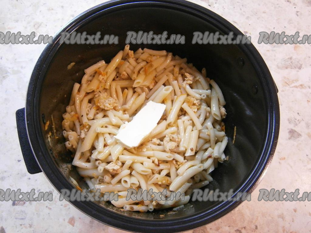 Далее выложить в чашу макароны, хорошо перемешать с фаршем. Добавить сливочное масло и выставить режим "Разогрев" на 15 минут.